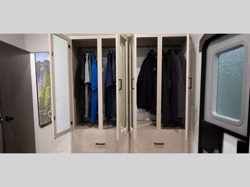 Sleeps 6 Slides 3 Length 43 ft 10 in Ext Width 8 ft Ext Height 12 ft 8 in Int Height 8 ft Hitch Weight 1475 lbs Dry Weight 11484 lbs Cargo Capacity 1991 lbs Fresh Water Capacity 40 gals Grey Water Capacity 70 gals Black Water Capacity 80 gals Available Beds Two Queen with Versa Tilt Refrigerator Type Stainless Steel Number of Awnings 1 Water Heater Type On Demand Tankless Awning Info 21' with LED "Blade Lighting" Under Awning Axle Count 2 Shower Type Walk-In Shower Similar Floorplans