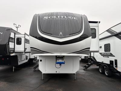 The Grand Design Solitude is a spacious luxury fifth wheel that offers tall ceilings, larger windows, and 101-inch body width. The Solitude is loaded with storage space and packed with amenities that add class and luxury to the camper. Some of these include a kitchen island, entertainment center with a fireplace, theatre seating, an outdoor kitchen, an auto-leveling system, a residential refrigerator, as well as dishwasher and laundry prep. Shop for the Grand Design Solitude at Dick’s RV in Durand, WI, and stop by our dealership for a showing.