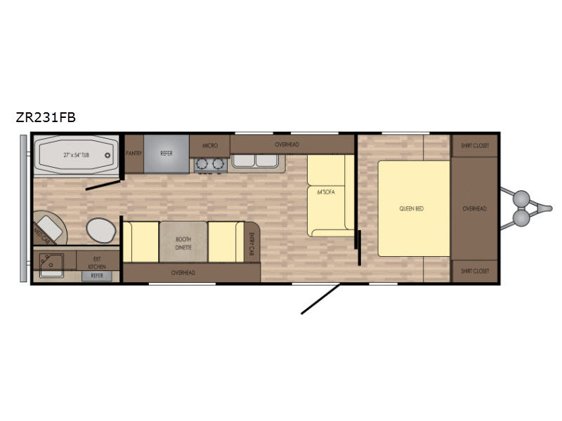 For your next camping trip, choose to do it in style and comfort with the CrossRoads RV Zinger Series ZR231FB travel trailer. This model features a front bedroom, a rear bathroom, plus an outdoor kitchen!