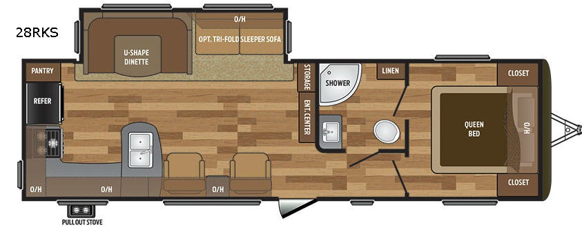 The rear kitchen features a u-shaped counter with double sink facing inward toward the seating area and door. There is counter space along the curb side wall for food prep, and plenty of overhead storage for your daily dishes and things. Along the rear wall you will find a three burner range, a refrigerator, and food pantry for your canned and dry goods.